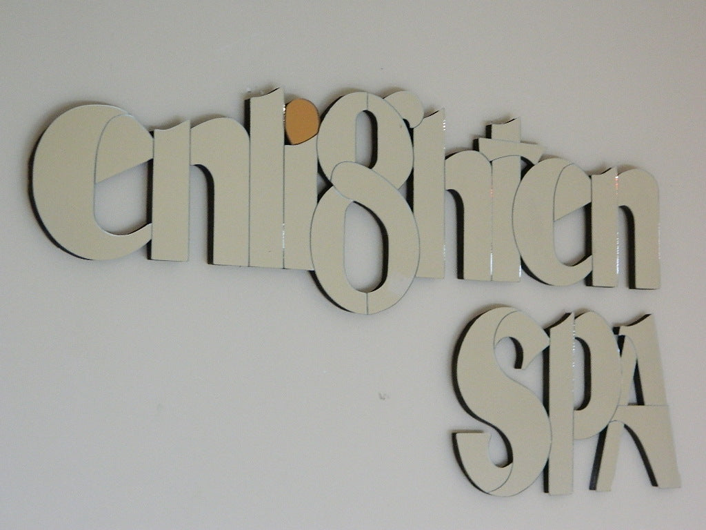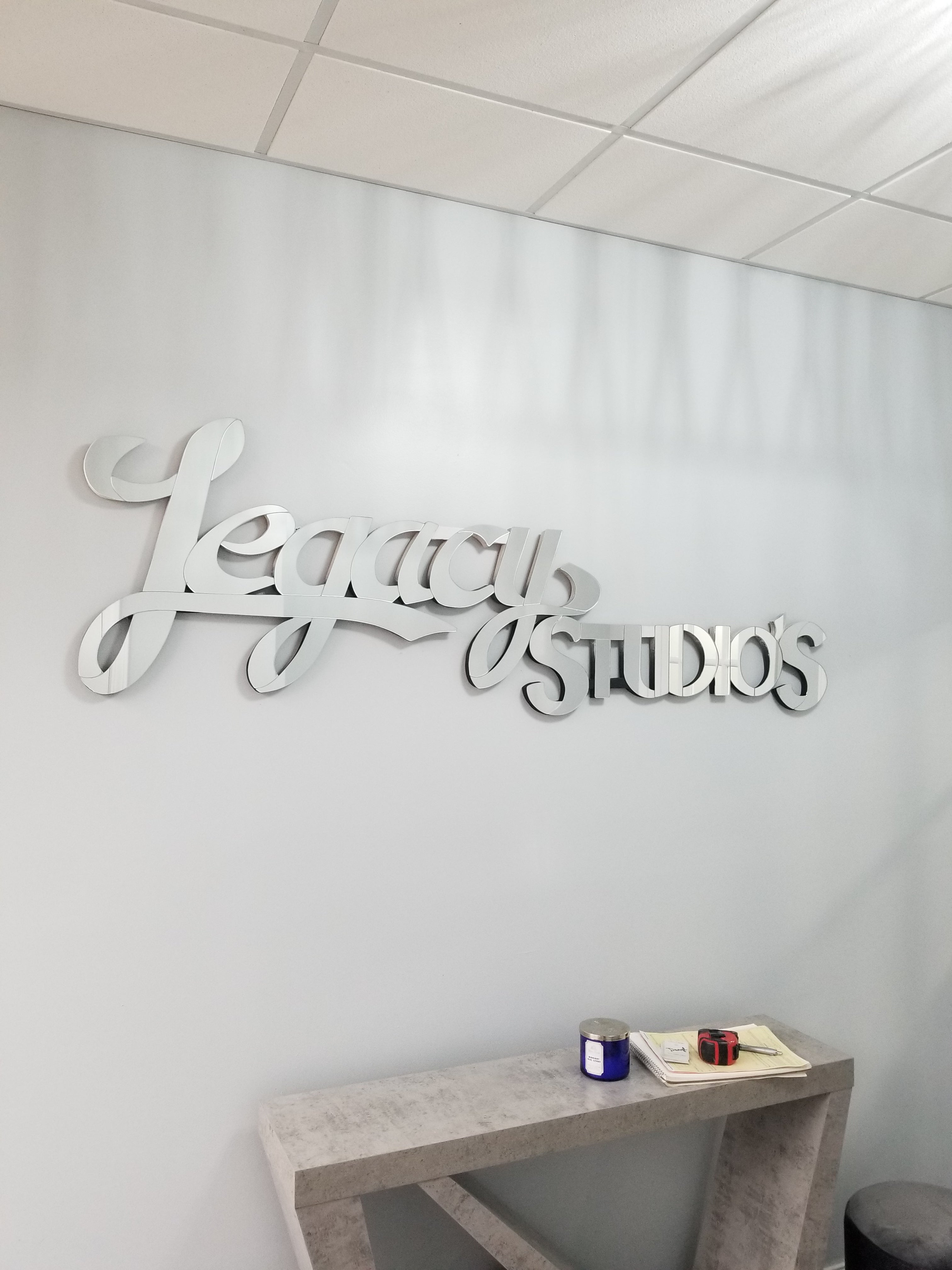 "A custom mirror design featuring sleek lettering and creative detail, perfect for a modern business."
