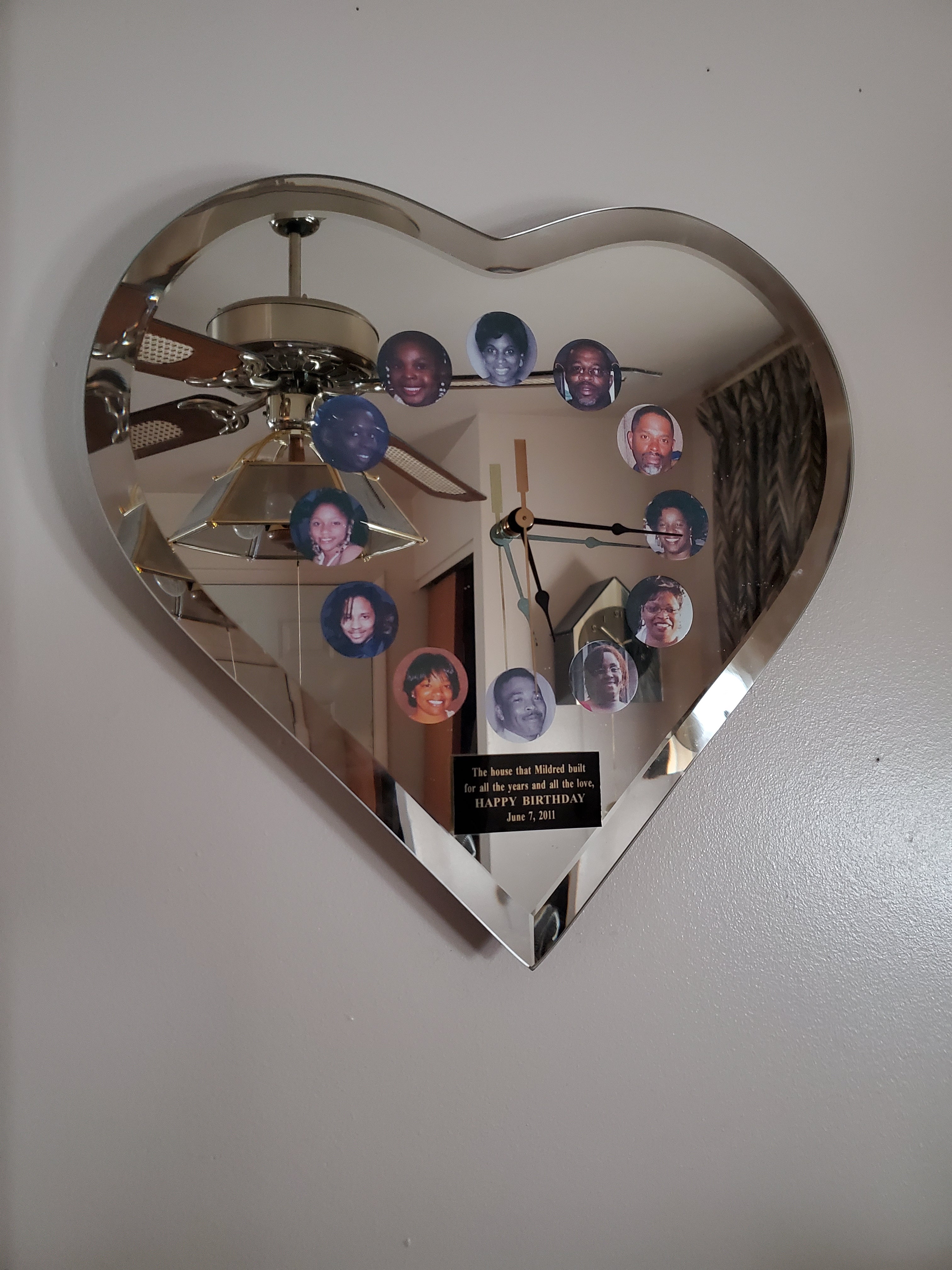 "A custom heart-shaped mirror clock capturing a daughter’s journey through twelve cherished years."