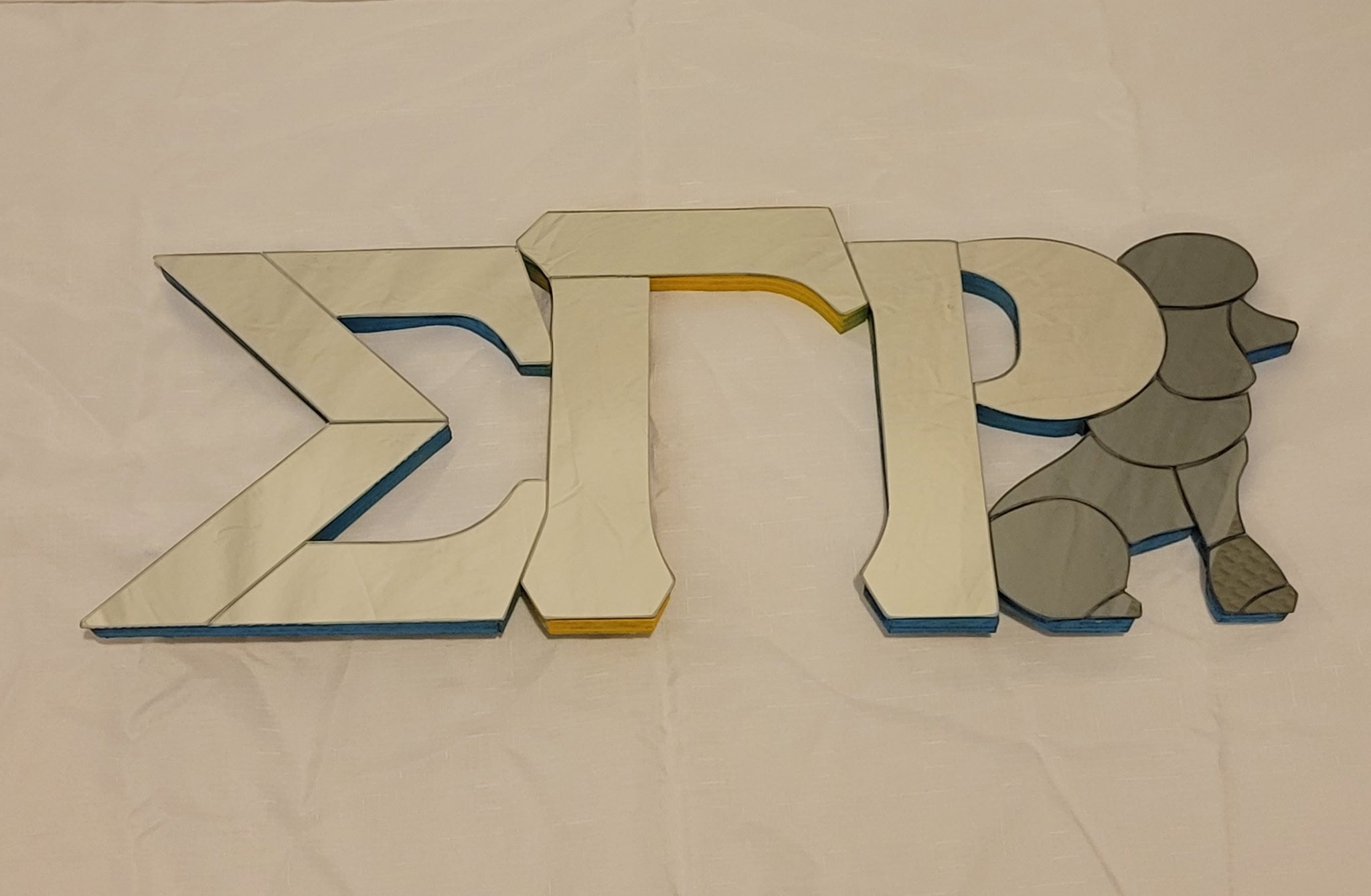 "A custom mirror featuring the bold Greek letters Sigma Gamma Rho, proudly accompanied by the iconic graceful poodle sitting elegantly at its side—celebrating sisterhood and style."
